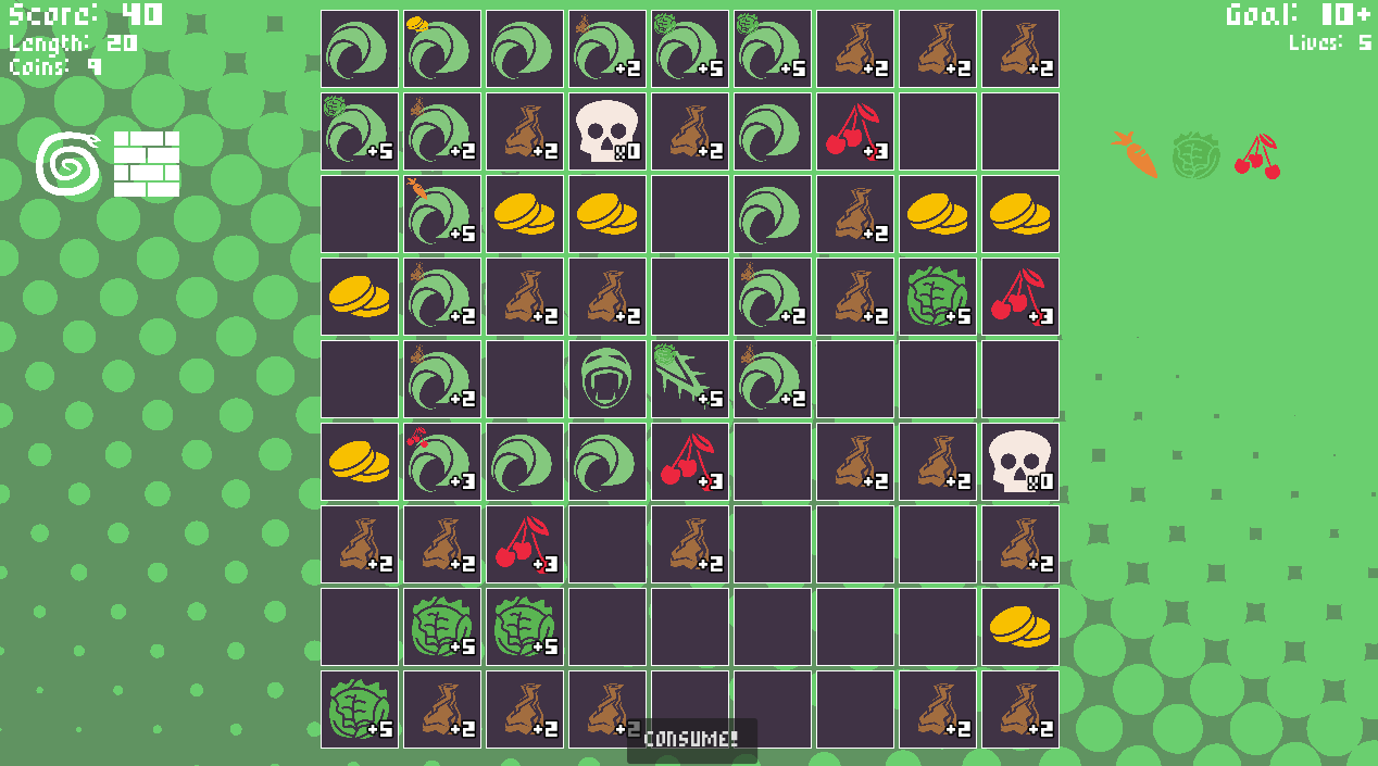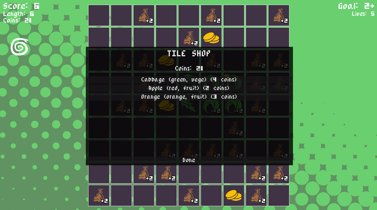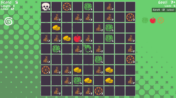 You need to consume as much as you can for scoring, and then eat your tail to complete the loop! Manage your length, obstacles, and collecting coins. Buy new tiles and get new trinkets!